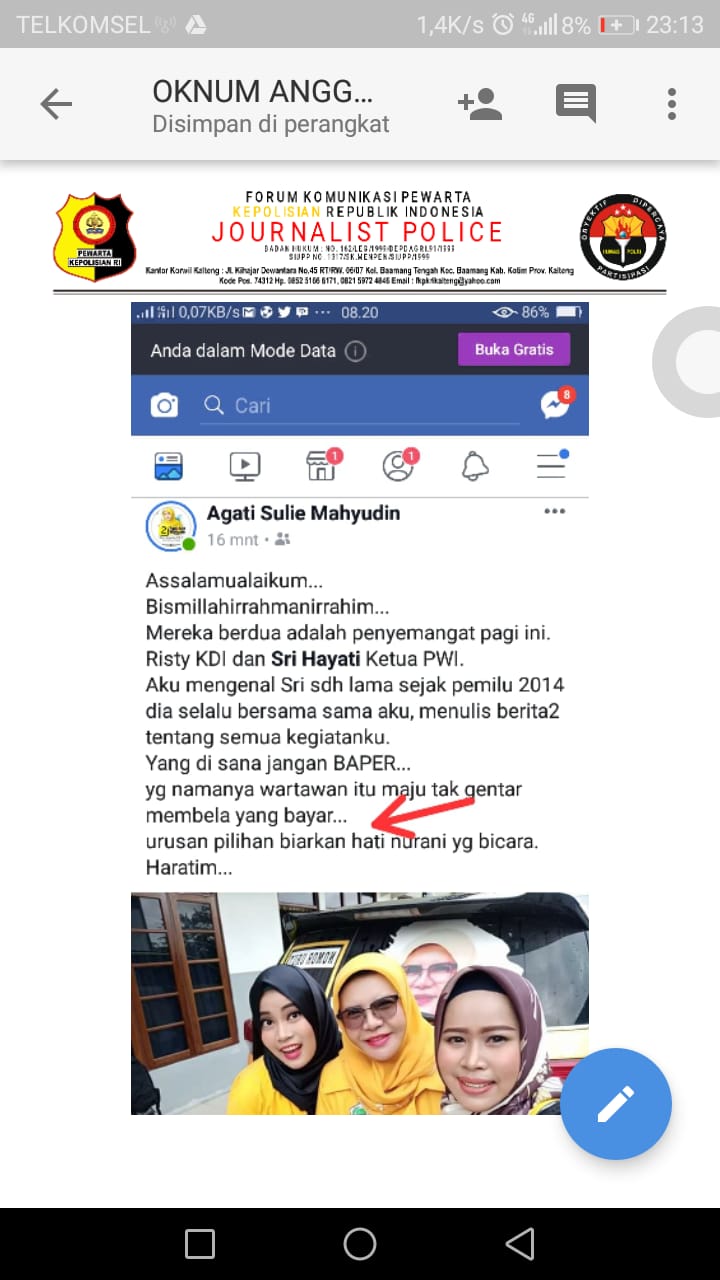Kalteng IB-“Dalam Postingan Facebook Agati Sulie Mahyudin menyebutkan bahwa Wartawan itu Maju Tak Gentar Membela Yang Bayar, hal ini memaksa Korwil FKPK-RI di Kalteng Geram dan Angkat Bicara”07-04-2019 Journalistpolice.com