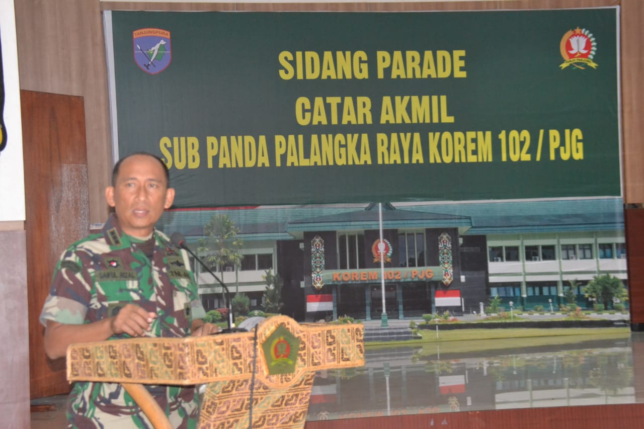 Palangka Raya IB-Pastikan Saring yang Terbaik, Danrem 102/Pjg Pimpin Sidang Parade Catar TA 2019alangka Raya – Sebanyak 32 pemuda terbaik lulusan SMA di wilayah Provinsi Kalimantan Tengah mengikuti Sidang Parade Catar (Calon Taruna) Akmil (Akademi Militer) Sub Panda Palangka Raya TA. 2019 yang dipimpin langsung Komandan Korem 102/Panju Panjung, Kolonel Arm. Saiful Rizal, S. Sos, bertempat di Aula Makorem, Jl. Imam Bonjol No.05 Palangka Raya, Jumat (10/5).