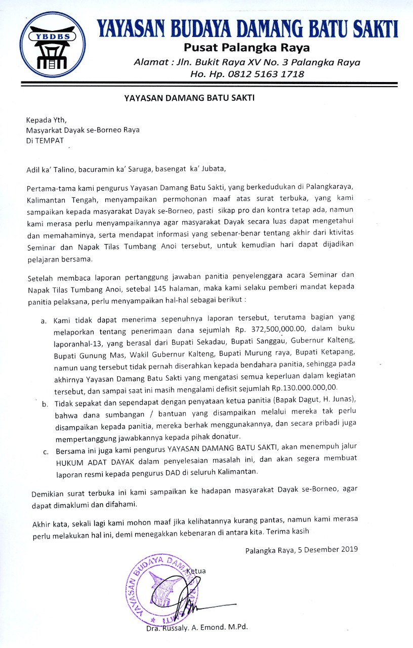 Hal itu disampaikan Ketua Yayasan Damang Batu Sakti, Dra. Rossaly. A.Emond. M.Pd, yang berkedudukan di Palangkaraya – Kalimantan Tengah, melalui surat terbuka kepada seluruh masyarakat Dayak se-Borneo, Kamis (5/12/2019).