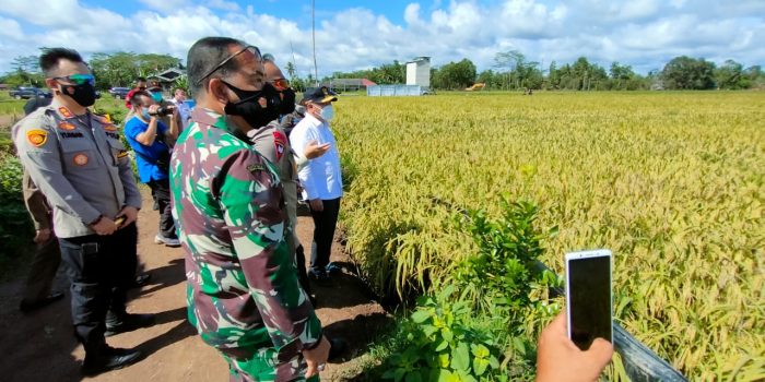 Palangka Raya -IB Komandan Korem (Danrem) 102/Pjg Brigjen TNI Purwo Sudaryanto bersama-sama dengan Gubernur Kalimantan Tengah (Kalteng) Sugianto Sabran dan Kapolda Kalteng Irjen Pol Dedi Prasetyo kembali meninjau area tanaman padi siap panen di lokasi Food Estate, Desa Belanti Siam, Kecamatan Pandih Batu, Kabupaten Pulang Pisau, Kalimantan Tengah.