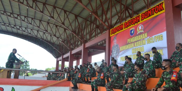 BUNTOK – MKNews-Komandan Korem (Danrem) 102/Pjg Brigjen TNI Purwo Sudaryanto memberikan arahan kepada anggota Kodim 1012/Btk, bertempat di Stadion Batuah jalan Pelita Raya Kota Buntok, Kabupaten Barito Selatan, provinsi Kalimantan Tengah (Kalteng), kamis 4 Februari 2021.