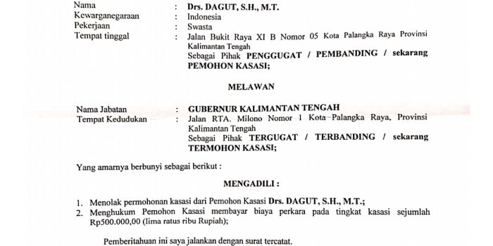 Dalam surat tersebut terlampir surat pemberitahuan isi putusan Mahkamah Agung RI dalam perkara No: 27/G/2019/PTUN. PLK, yang mana pada tanggal 6 Mei 2021 panitera PTUN Palangka Raya telah memberitahukan kepada Gubernur Kalteng tentang isi Putusan Makamah Agung R.I No 541 K/TUN/2020 tanggal 8 Desember 2020 dalam perkara antara Drs. Dagut, SH., MT sebagai penggugat/Pembanding/Termohon kasasi, yang mana amarnya berbunyi sebagai berikut: