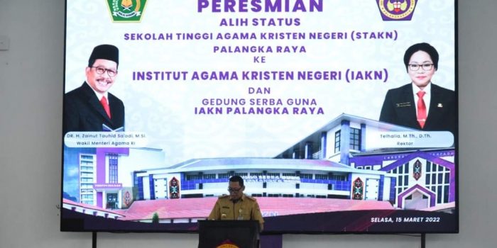 PALANGKA RAYA – IB. Staf Ahli Gubernur Bidang Ekonomi, Keuangan dan Pembangunan Yuas Elko, mewakili Gubernur Kalimantan Tengah mendampingi Wakil Menteri Agama Zainut Tauhid Sa’adi menghadiri acara Peresmian Alih Status Sekolah Tinggi Agama Kristen Negeri (STAKN) Palangka Raya menjadi Institute Agama Kristen Negeri (IAKN) di Gedung Serba Guna, Kota Palangka Raya, Selasa (15/3/2022).