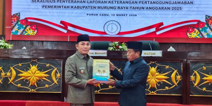 Pemerintah Kabupaten Murung Raya, Kalimantan Tengah menyerahkan Laporan keterangan Pertanggungjawaban (LKPJ) tahun anggaran 2025 kepada DPRD kabupaten setempat melalui rapat paripurna yang dilaksanakan di Puruk Cahu, Selasa (10/3/2026).